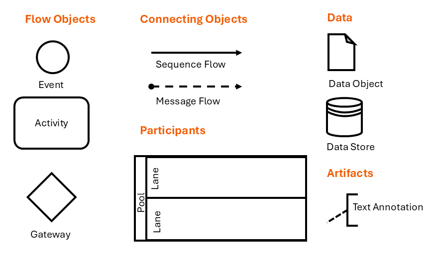 The power of BPMN lies in its manageable set of symbols that can be combined to create complex process diagrams. For automation, the Flow Objects are particularly crucial. They are connected by Connecting Objects and organized into areas of responsibility called Swimlanes.