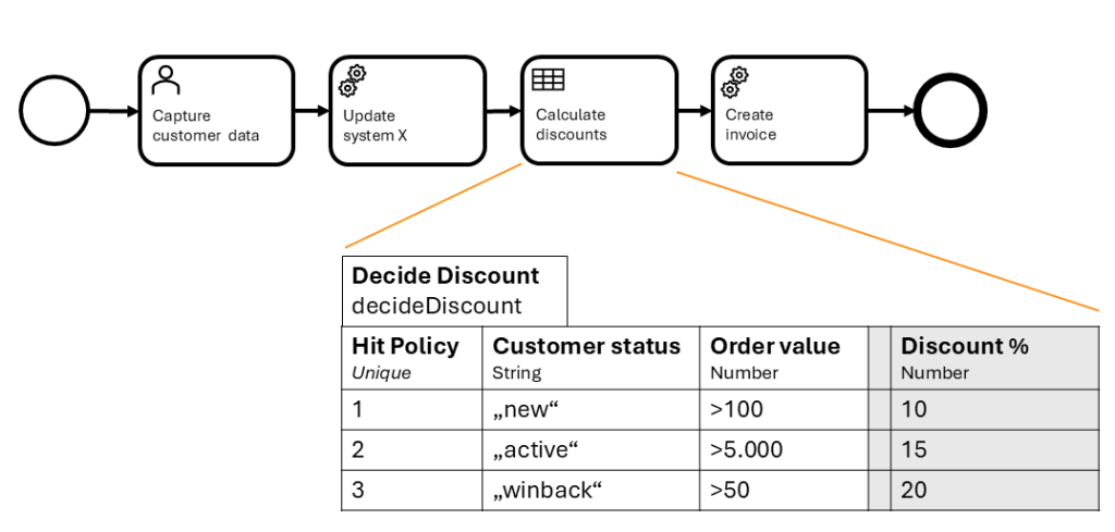 This powerful combination allows you to build processes that are both flexible in their flow (BPMN) and intelligent in their logic (DMN).