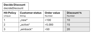 Decision Tables are the heart of DMN’s decision logic level. They are a precise and easy-to-read way to represent conditional logic (if-then rules). A decision table consists of columns and rows: